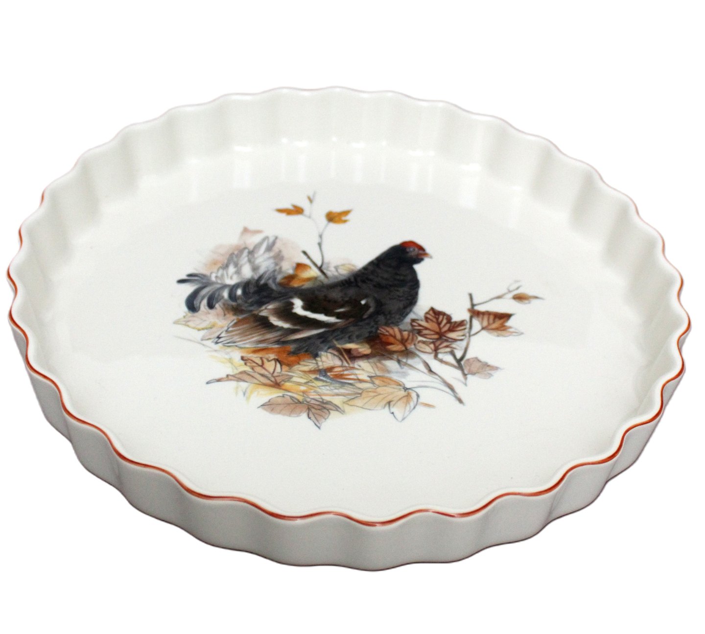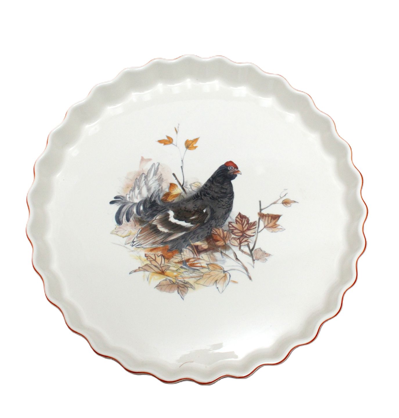 Villeroy & Boch, Jagtstellet designet af Mads Stage for Imerco. Stort Tærtefad med Urfugl. Fadet har en mere cremet farve end resten af Mads Stage stellet og er produceret af Villeroy & Boch. Fadet er ovnfast, tåler microovn og opvaskemaskine.  Diameter 30 cm. Højde 4 cm. Flot ubrugt stand. Pris: 750 kr. Lager: 1