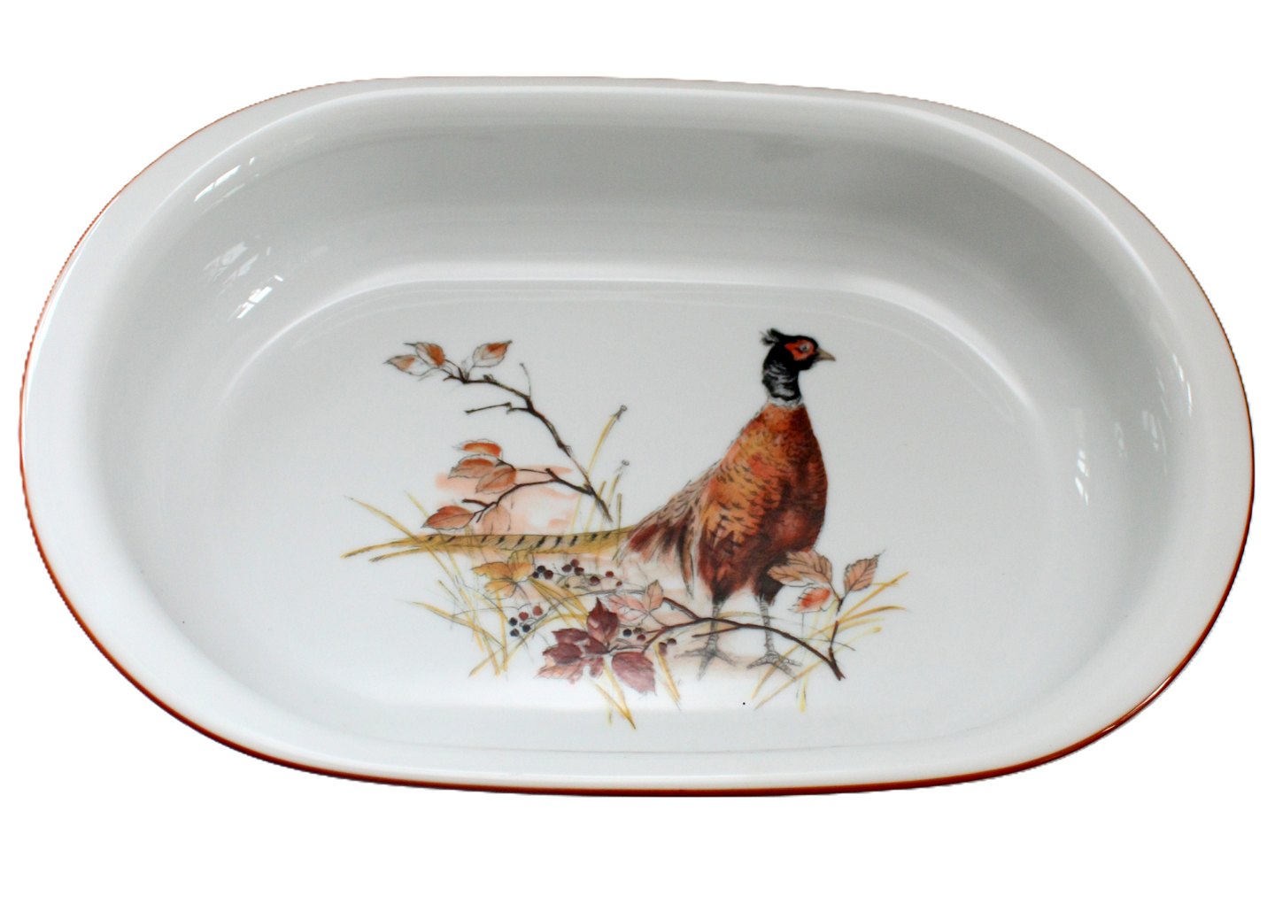 Mads Stage, Jagtstellet designet af Mads Stage for Imerco. Dybt ovalt fad med Fasan kok. Højde 6 cm. Længde 30 cm. Bredde 19,5 cm. Der er ingen mærke i bund. Pris: 625 kr. Lager: 1
