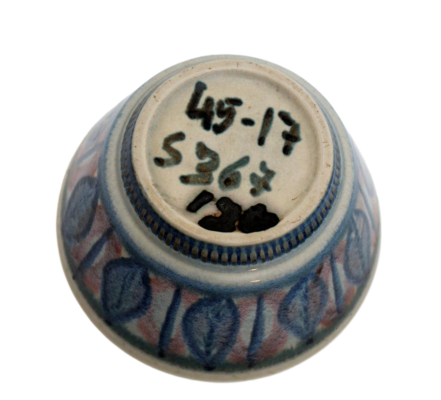 Knabstrup, Unika skål med farveprøver, formen på skålen er fra Knapstrupstellet. Skålen har tilhørt en af malerinderne på Knabstrup. Virkelig smuk og dekorativ skål. Farveprøve nr. 45-17 S367 190. Pris: SOLGT