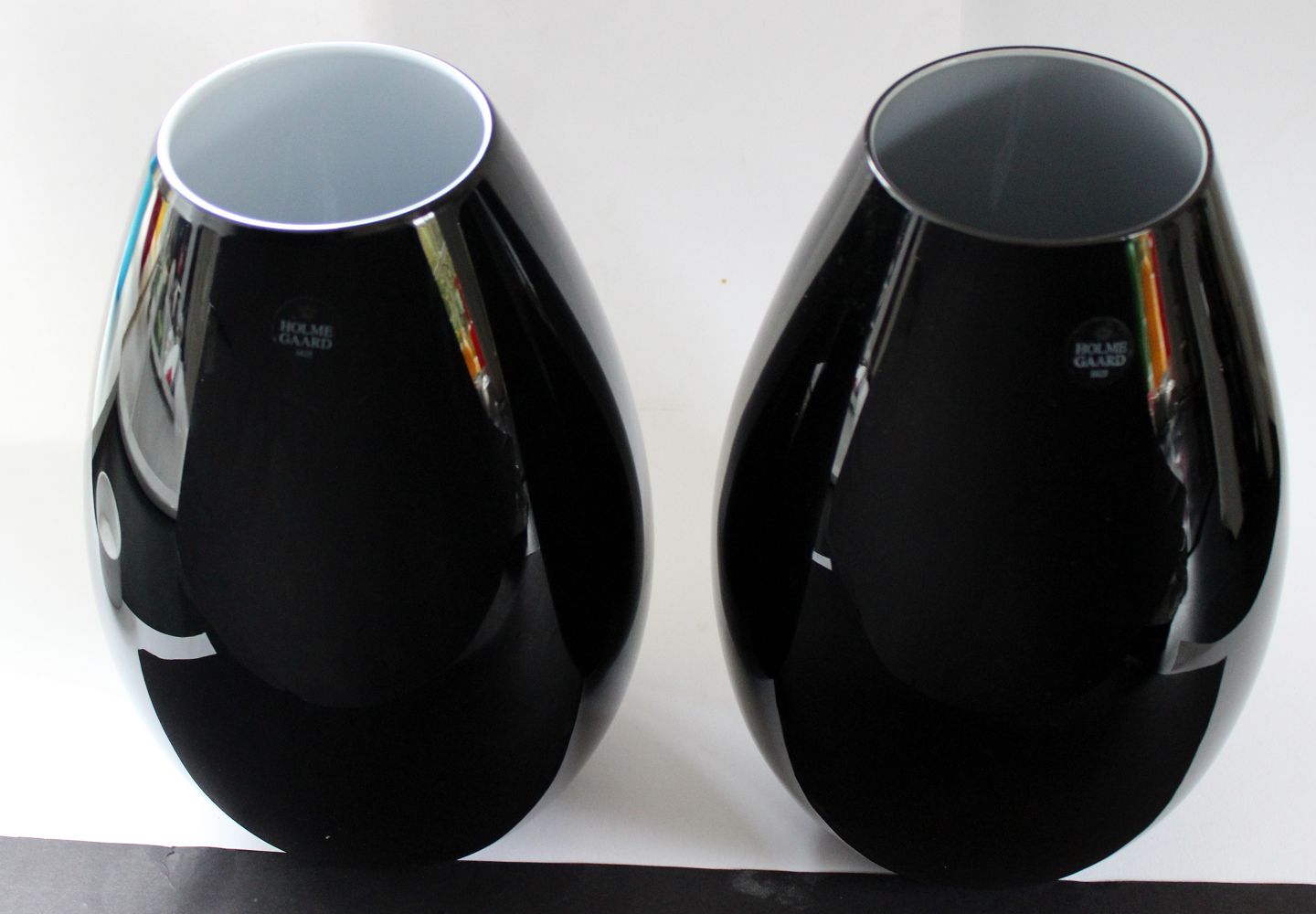 Holmegaard, Cocoon stor vase i sort glas udvendig med hvid glas indvendig. Designet af Peter Svarrer i 2005. Største vase. Højde 26 cm. Øverste diameter 9 cm. Trykt signatur og Holmegaard label. Den ene er tungere og mere hvid indvendig, den har også nogle brugsridser udvendig, gør venligst opmærksom på hvilken der ønskes.